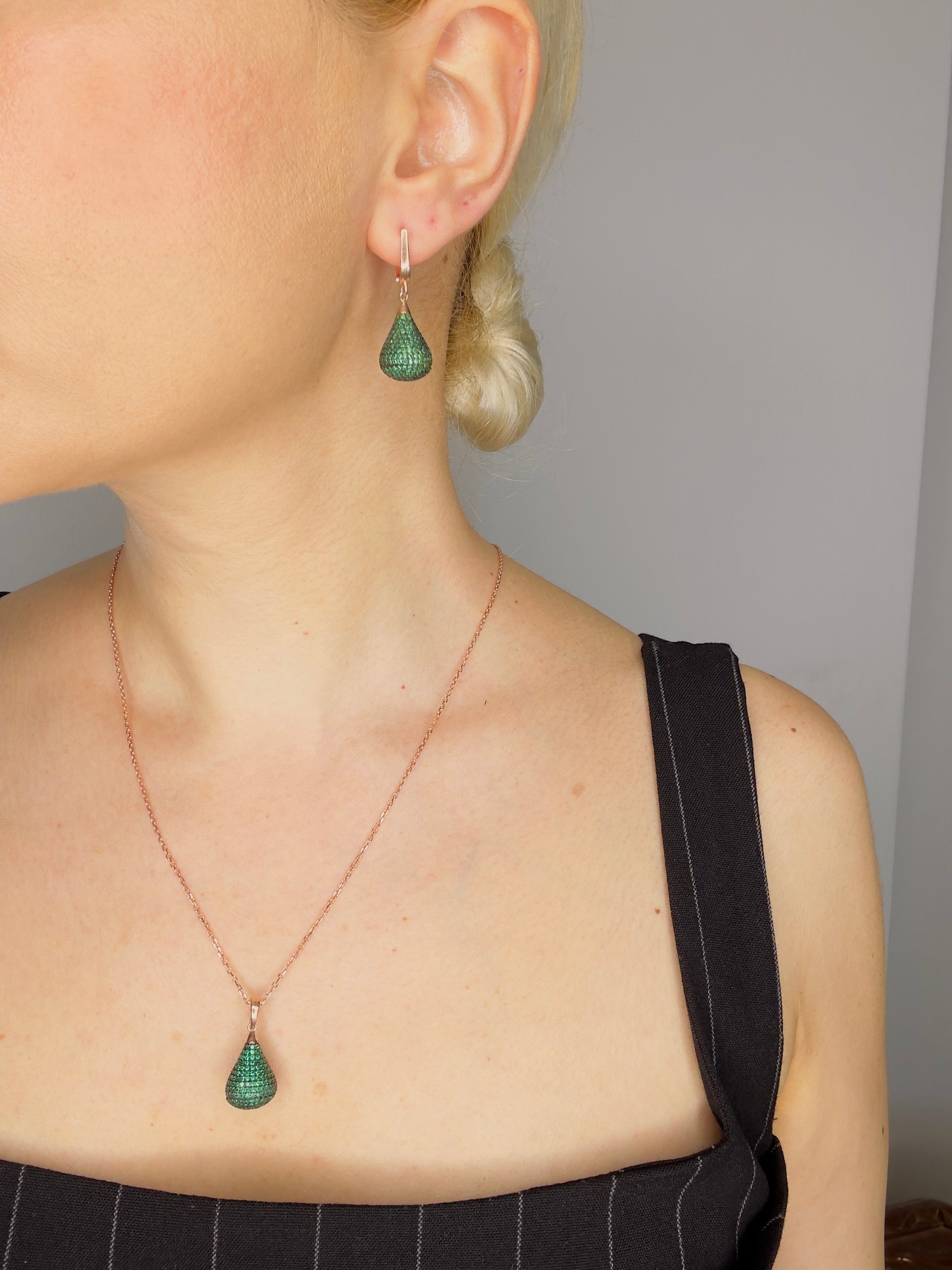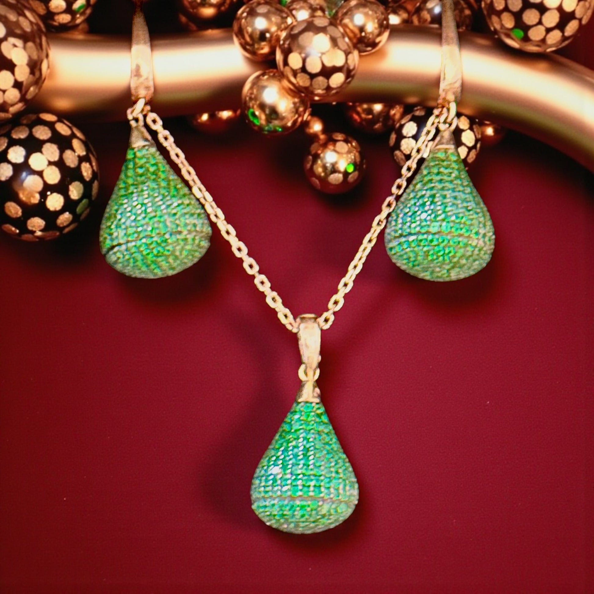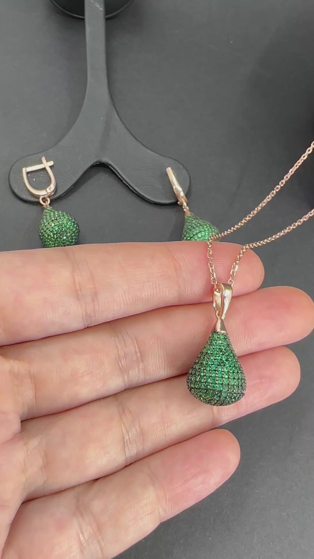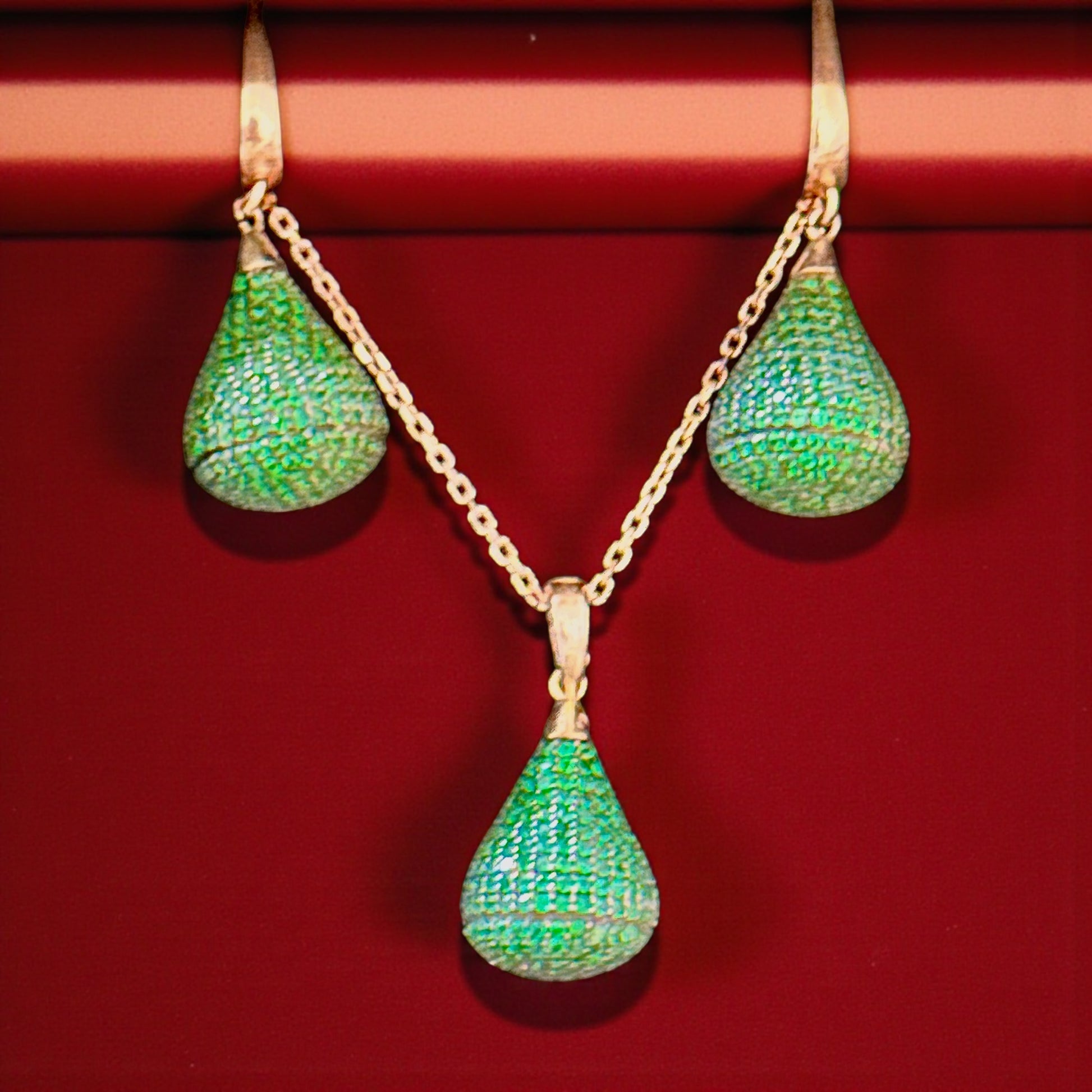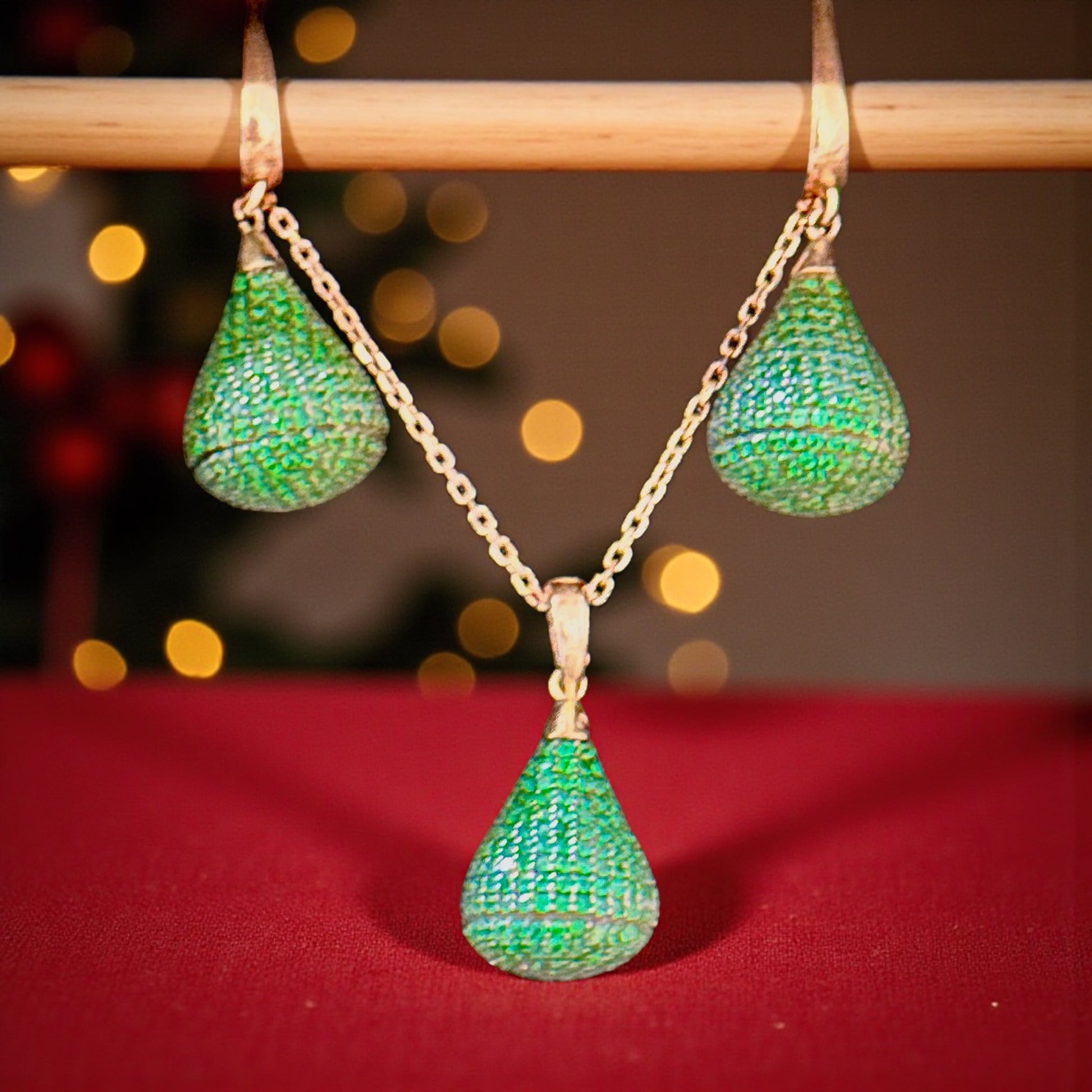 925 ayar gümüş üzeri 18 K altın kaplama ve 1. sınıf zirkon taşların pırlanta ustalığı ile işlendiği modern ve zamansız bir kolye, küpe setidir. Yeni yıl ruhu ile yeşil kuzey ışıkları parlaklığında, pırlanta ışıltısında tasarlanan Umut Işığı Gümüş Set yenilenme, aydınlanma ve her bir yeşil ışık topunda yeni bir dilek yeni bir umut enerjisi taşımaktadır.