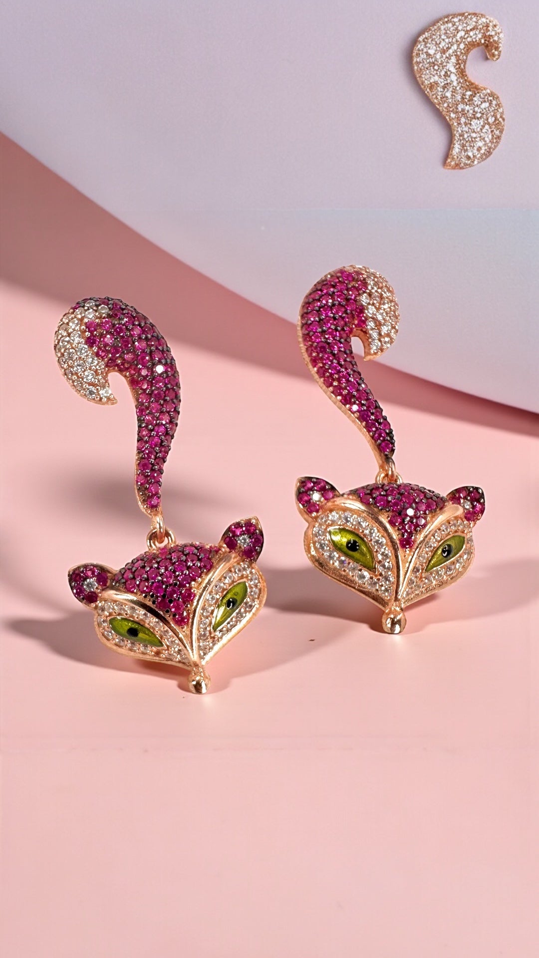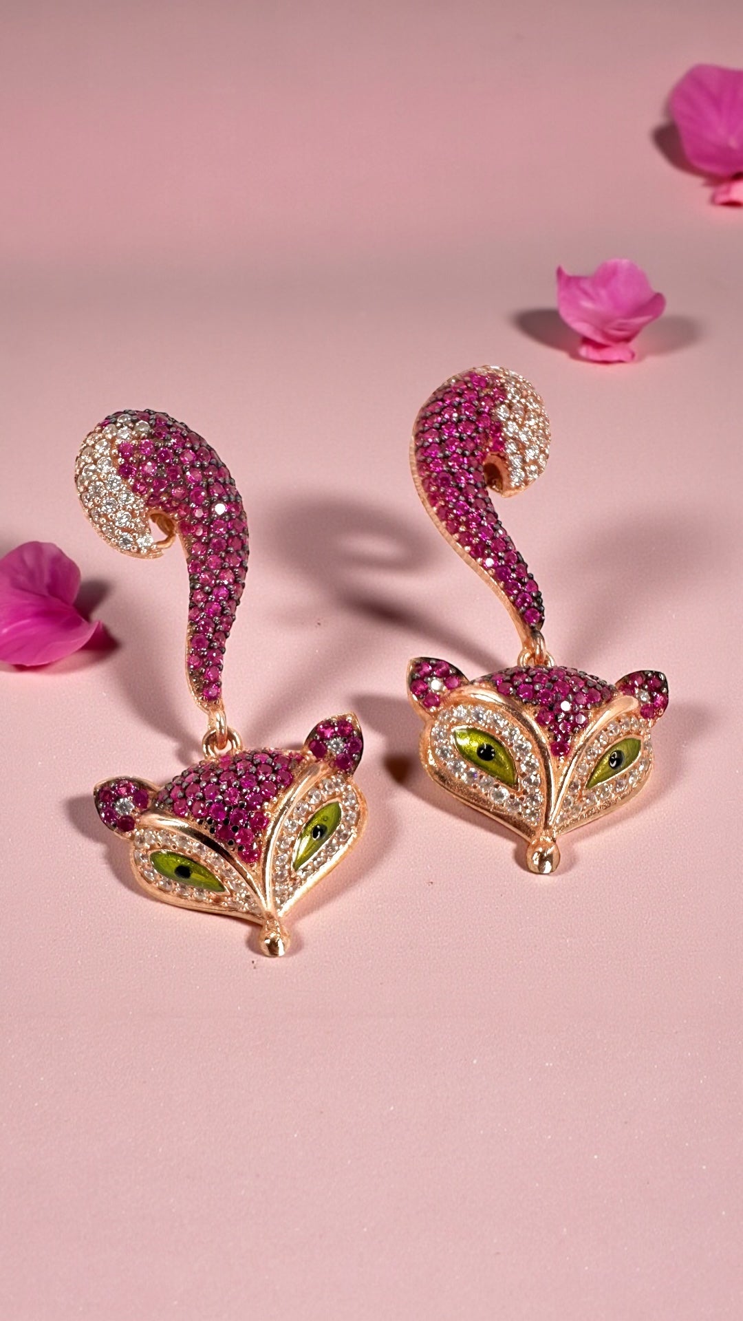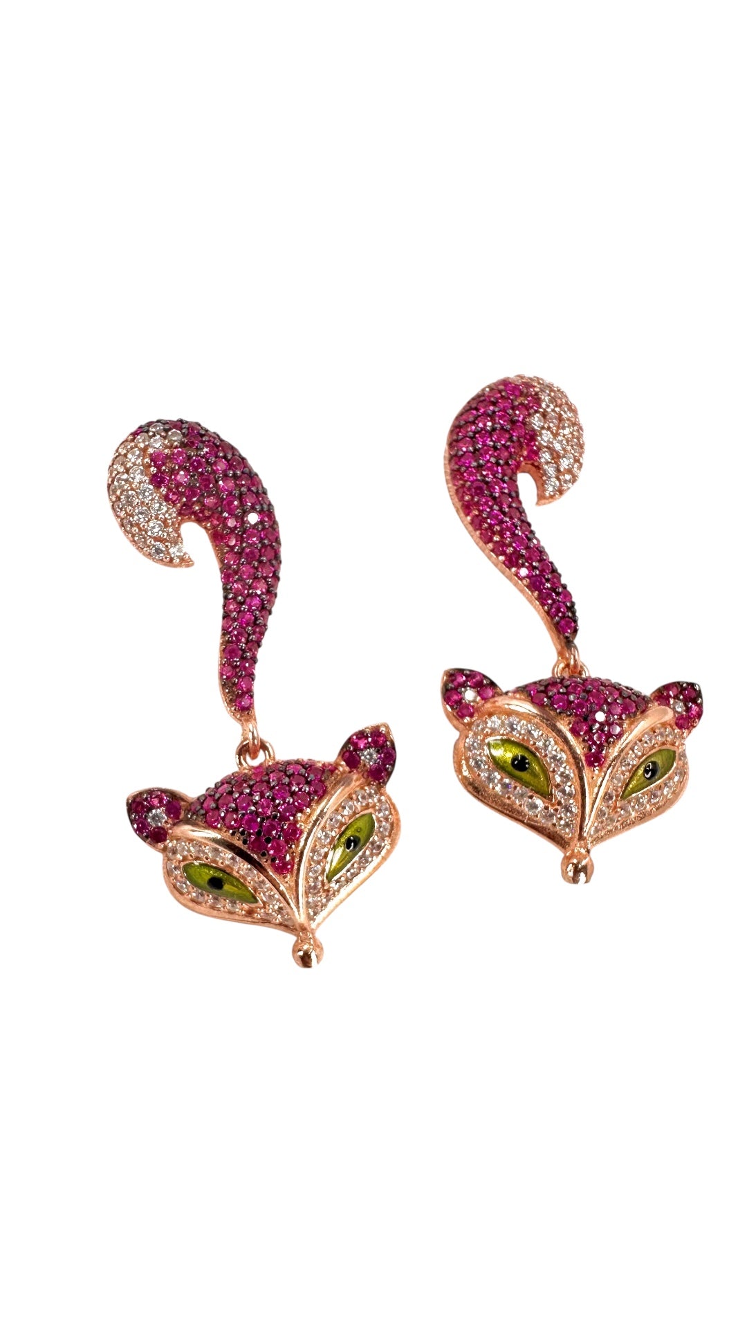 925 ayar gümüş üzerine 18 ayar rose altın kaplama ve pırlanta kesim doğal zirkon taşlarla işlenen bu özel tasarım tilki küpeler, Sevgililer Gününe özel olarak üretildi.