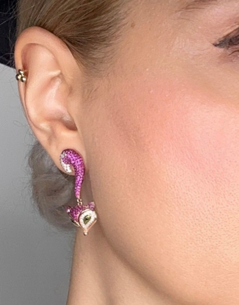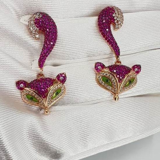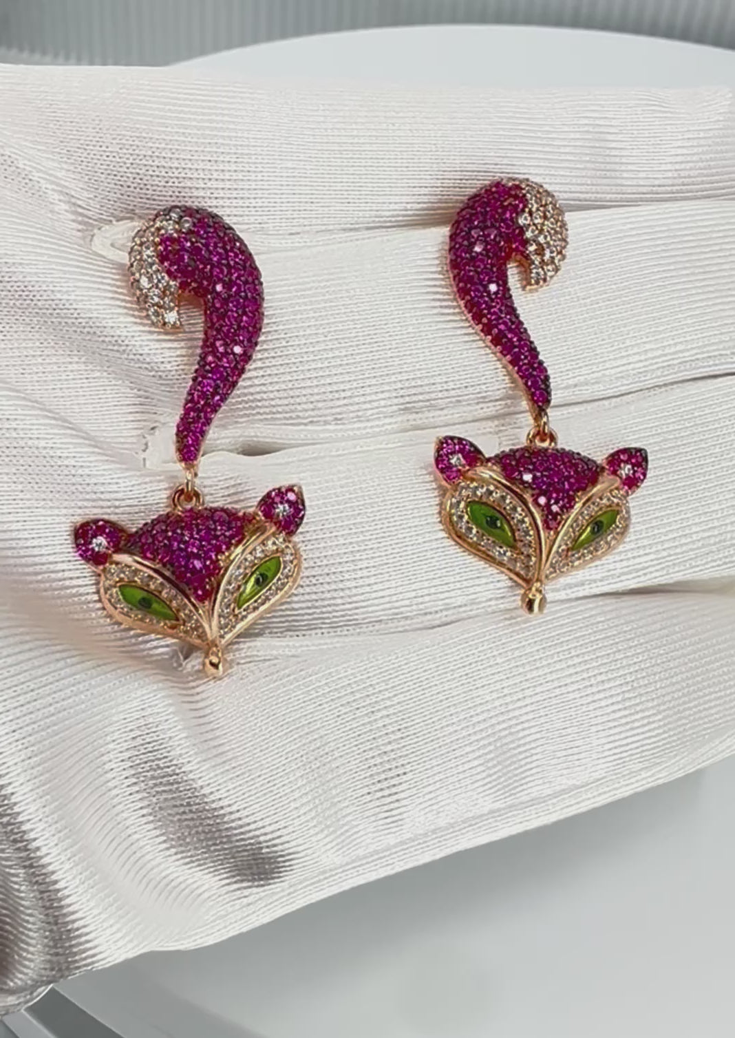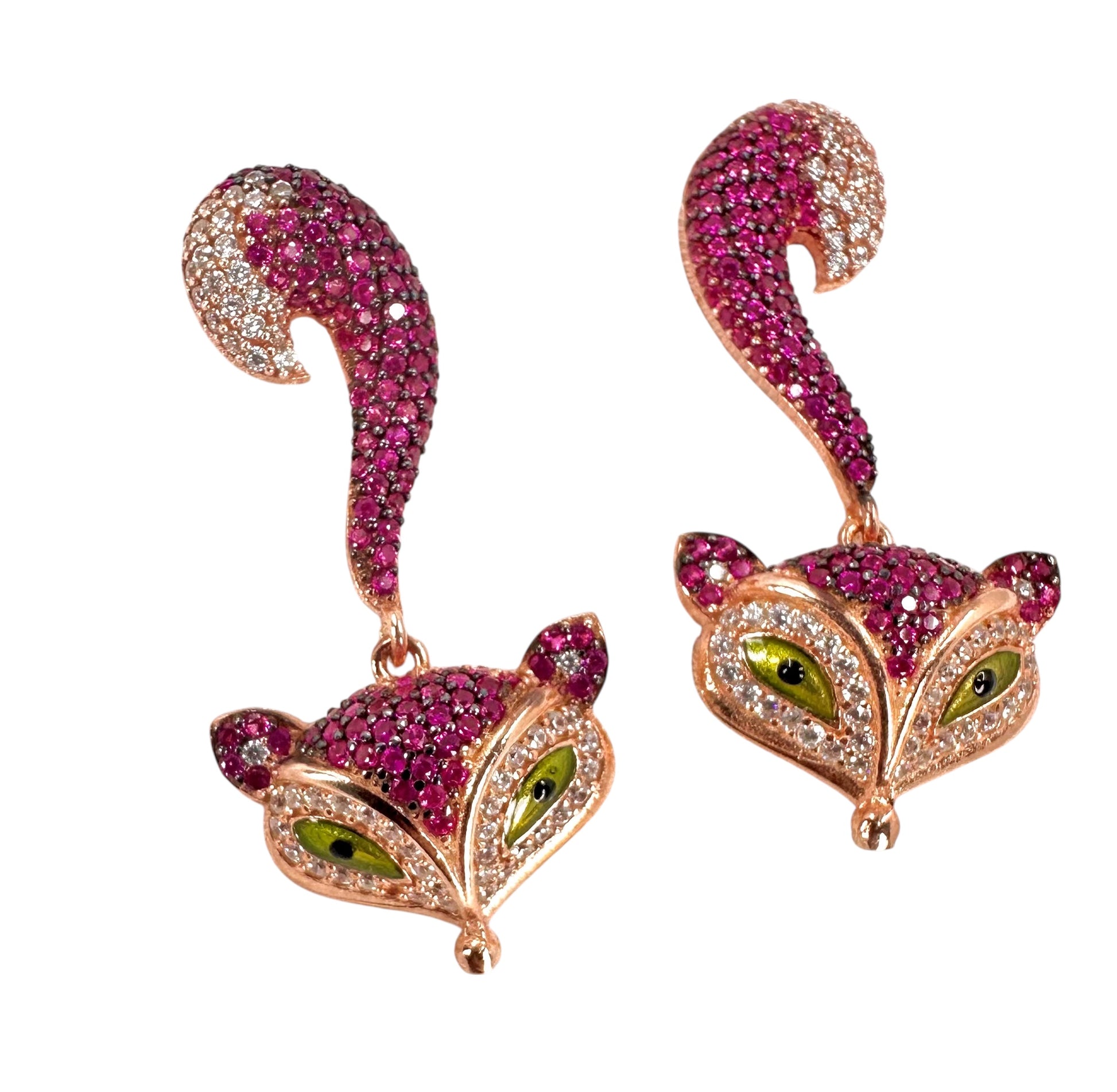 925 ayar gümüş üzerine 18 ayar rose altın kaplama ve pırlanta kesim doğal zirkon taşlarla işlenen bu özel tasarım tilki küpeler, Sevgililer Gününe özel olarak üretildi.