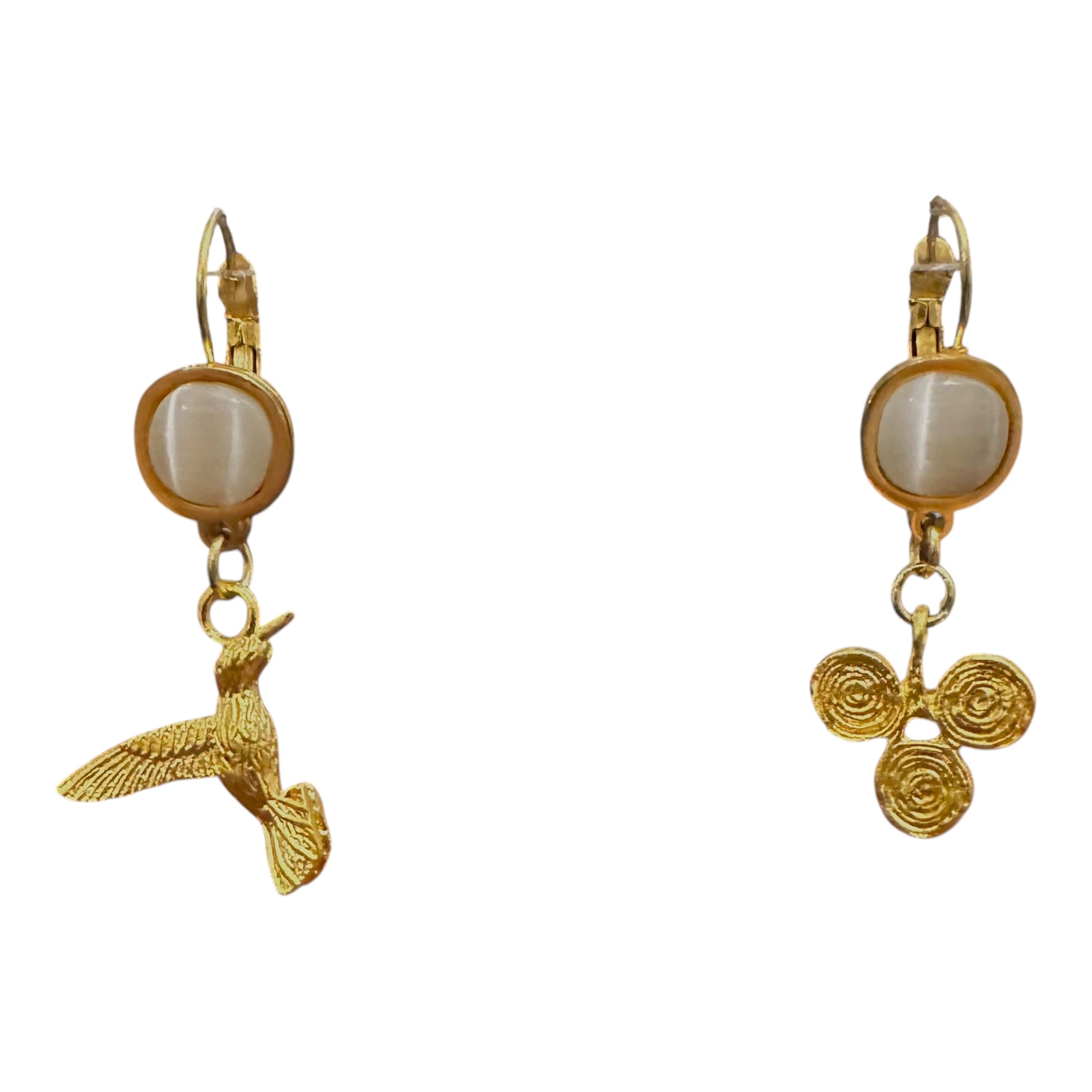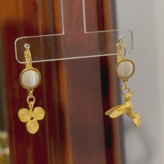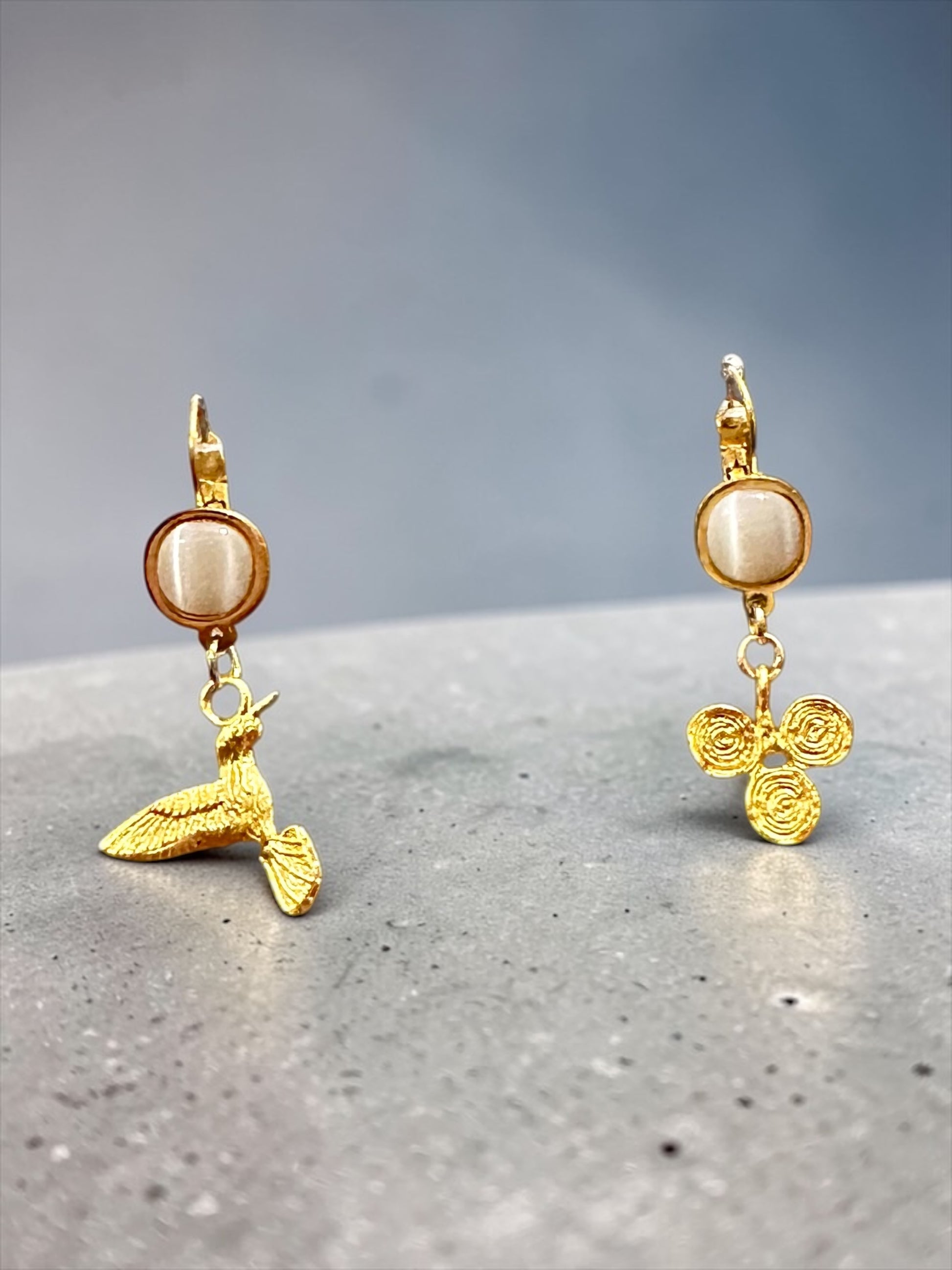 18K altın kaplama el yapımı küpe özel olarak tasarlanmış ve atölyemizde her bir parçası elde üretilerek, beyaz kedi gözü taşı ile taçlandırılmıştır. Artisan koleksiyon parçası ve az sayıda üretilmiş özel tasarımdır.Üzerinde 0.2 gram altın kaplama bulunmaktadır.