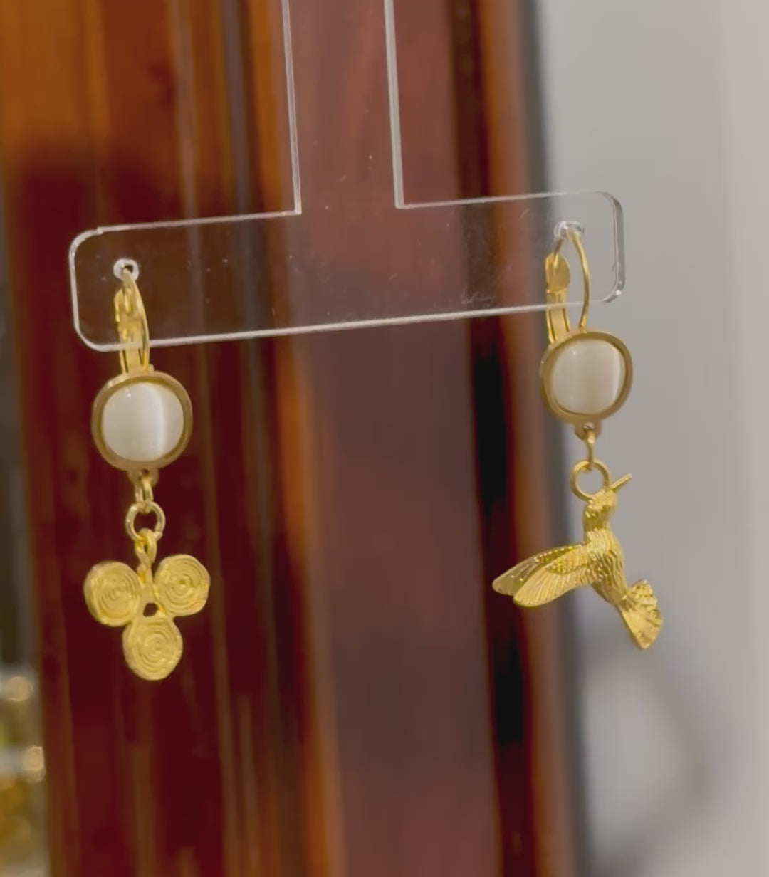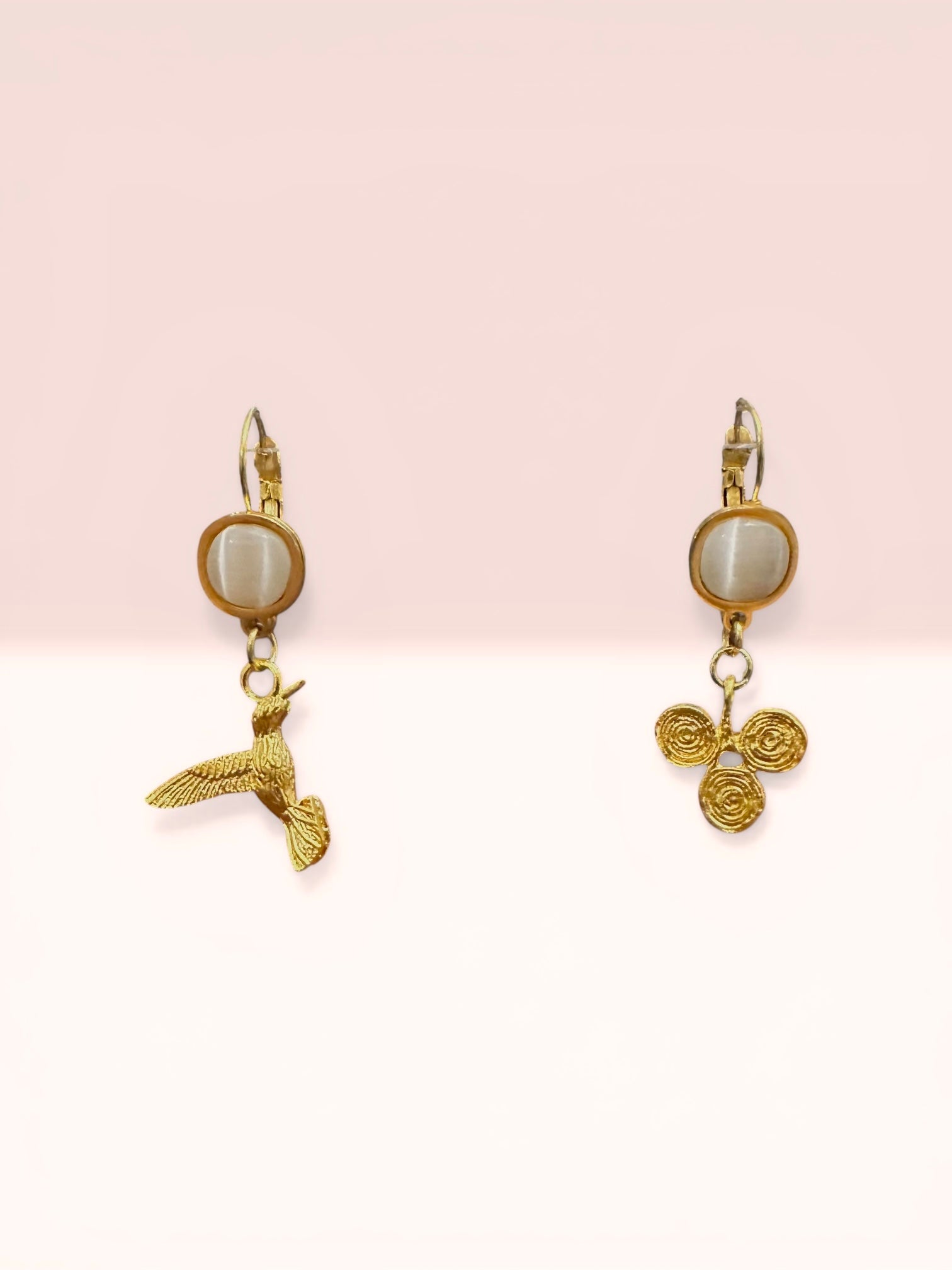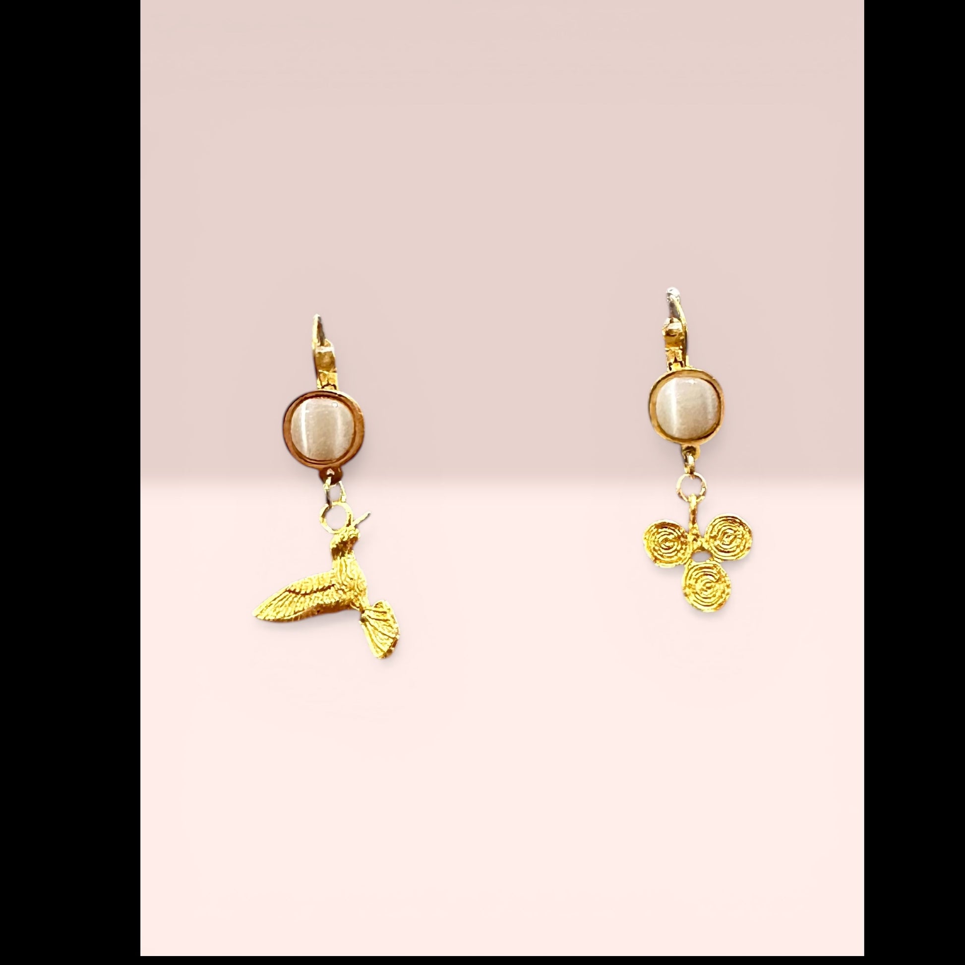 18K altın kaplama el yapımı küpe özel olarak tasarlanmış ve atölyemizde her bir parçası elde üretilerek, beyaz kedi gözü taşı ile taçlandırılmıştır. Artisan koleksiyon parçası ve az sayıda üretilmiş özel tasarımdır.Üzerinde 0.2 gram altın kaplama bulunmaktadır.